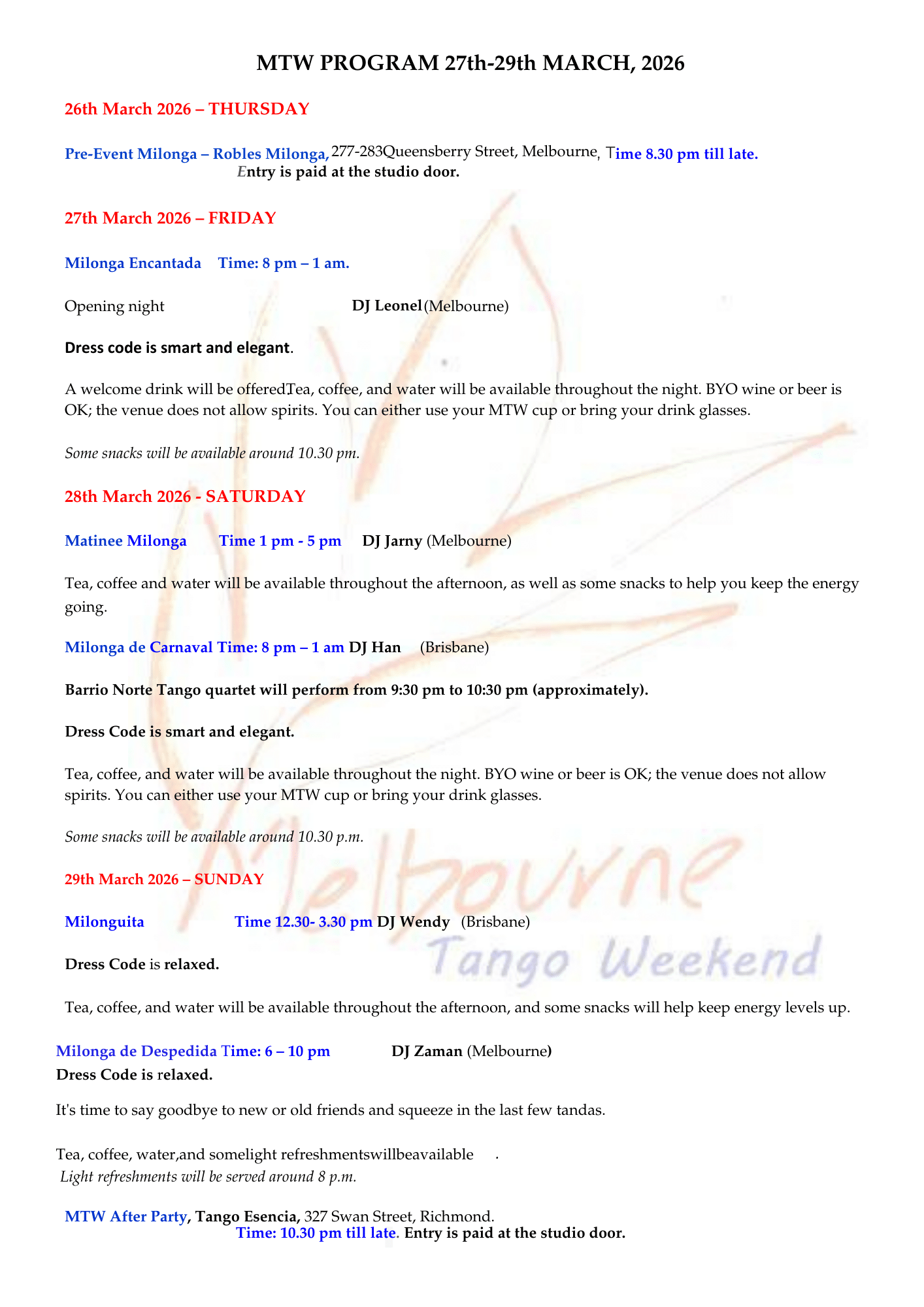 Join us at the Melbourne City Ballroom in the heart of the city for an unforgettable evening of tango. Enjoy the exquisite atmosphere, superb floor, air conditioning.